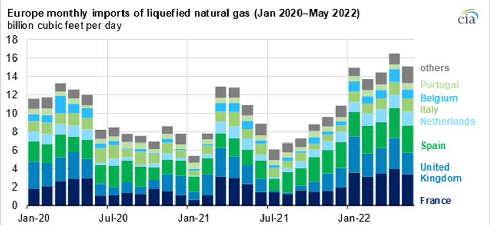 But it seems as if the lessons of history are forgotten as quickly as ice melts in summer. Over the past 10 years, Europe has become significantly more dependent on imports for natural gas. In 2010, Europe produced 35% of its natural gas. By 2020, Europe’s producing had dropped to a mere 20%. Here is a nice chart from the EIA depicting this decline: