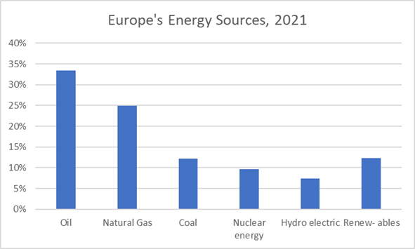 As you can see in the graph below, natural gas is the second largest source of Europe’s energy mix. The graph based on 2022 BP statistical review: