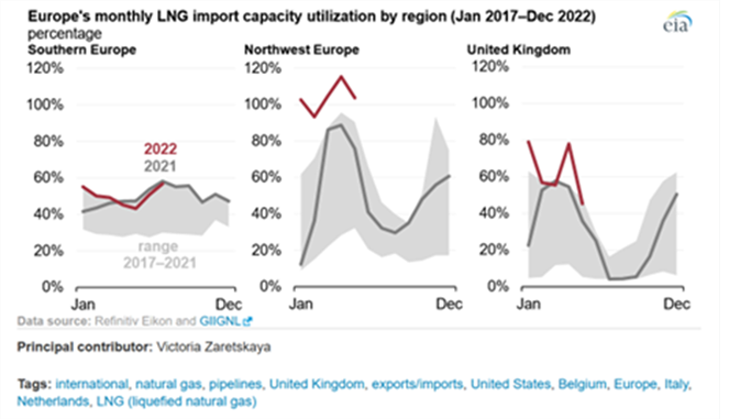 In addition, Europe’s natural gas market is very fragmented. A great example is the different in LNG import utilization by region. The increased LNG imports are stretching capacity in Northwestern Europe to the max. Running LNG import plants at such high capacity runs a risk of breakdowns or catastrophic issues since it means the LNG plants cannot shut down for regular maintenance.